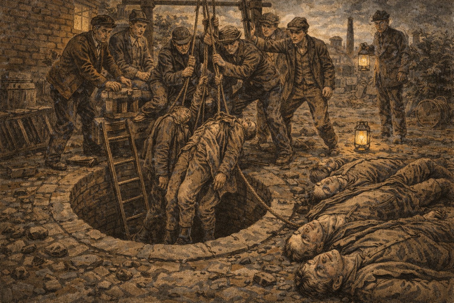 Two men have been employed in making a well at the Pottery, and on it being finished, one of them descended to ascertain the depth of water: as he did not return, his companion went down after him, and he likewise not returning, John Hill, the proprietor, with his four sons, went down the ladder in succession